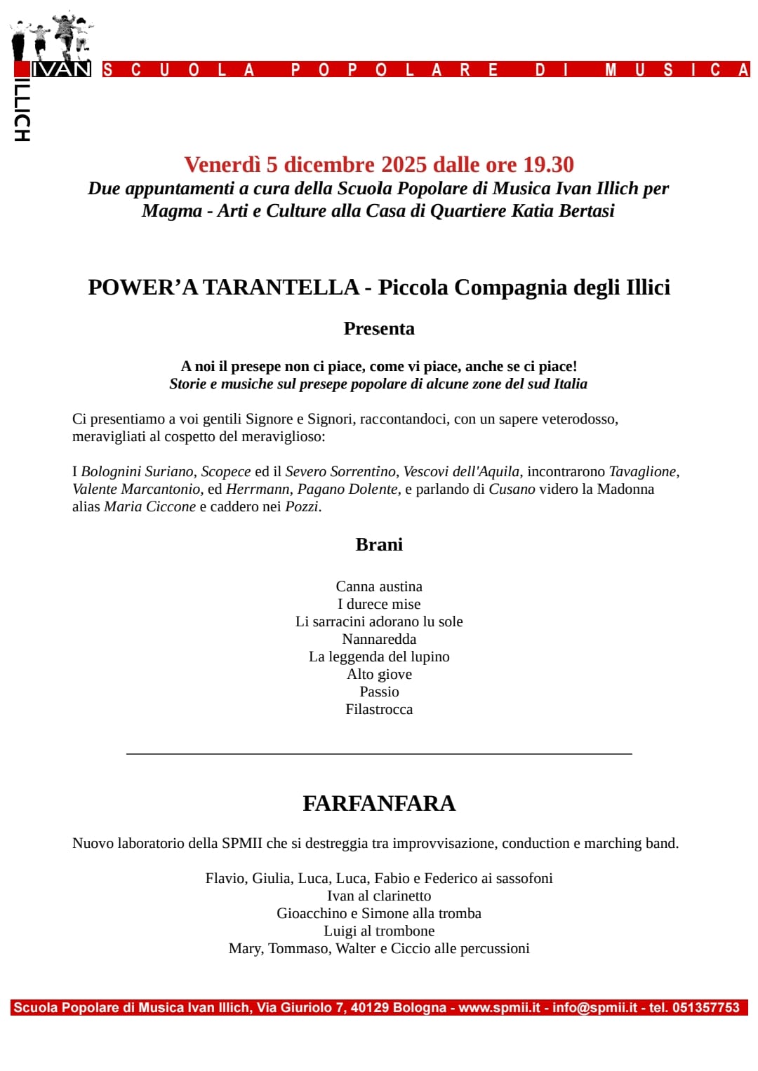 La festa, in quanto evento sociopoietico e poetico, è da sempre concepita dalla SPMII nel senso proprio dei due termini: “che crea socialità” e “ che ha efficacia artistica”. L’attenzione per le musiche popolari di tradizione orale nasce da un duplice interesse: quello per la comprensione dei diversi concetti di musica – e della rappresentazione del mondo attraverso i suoni - e quello per la festa, una delle azioni espressive universalmente utilizzate dalle diverse culture. Nei trent’anni e più di esperienze con antropologi e “portatori della tradizione” abbiamo imparato che la festa ha più centri e che intorno ad essi le dinamiche si sviluppano secondo una casualità animata dalle relazioni tra gli individui. Questa festa “molteplice” è “arte dell’incontro” e riconosce a tutti la dignità e l’importanza di esistere.